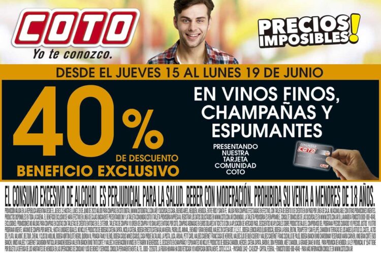 ¡Celebra con estilo y ahorra en tus bebidas favoritas en el supermercado Coto! Por tiempo limitado, disfruta de un generoso descuento del 40% en vinos finos, champañas y espumantes. Ya sea que estés planeando una cena especial o quieras brindar por una ocasión especial, encontrarás una amplia selección de opciones de calidad con precios irresistibles. No te pierdas esta oportunidad de deleitar tu paladar y hacer tus celebraciones aún más memorables con esta oferta exclusiva de Coto. ¡Aprovecha el descuento y brinda por momentos inolvidables!